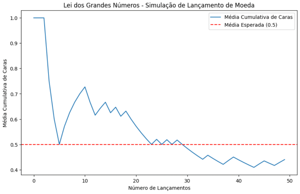 Por exemplo, se você jogar uma moeda justa (50% de chance de cara, 50% de chance de coroa) algumas vezes, é possível obter uma sequência como cara, cara, coroa, cara, o que não reflete exatamente a probabilidade de 50/50. No entanto, se você continuar jogando essa moeda, digamos, milhares ou milhões de vezes, verá que o número de caras e coroas se aproxima cada vez mais de uma divisão 50/50.